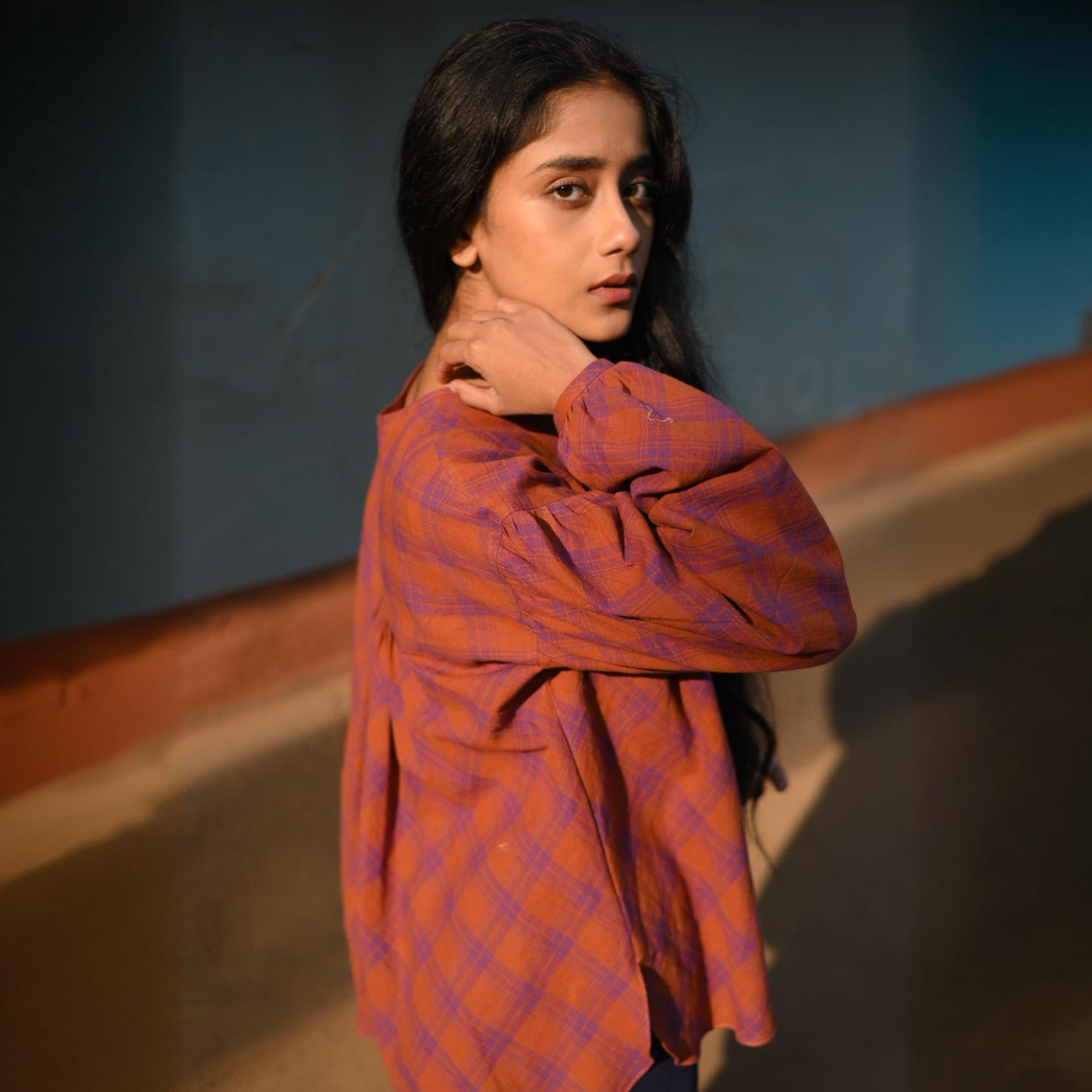 The Bliss Top is made from handwoven cotton check fabric, featuring small placement pleats and a front opening for a relaxed, chic look.